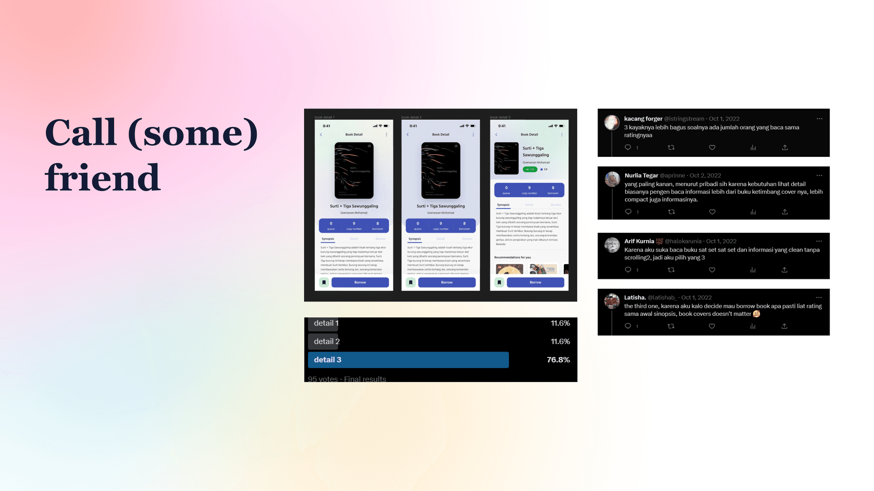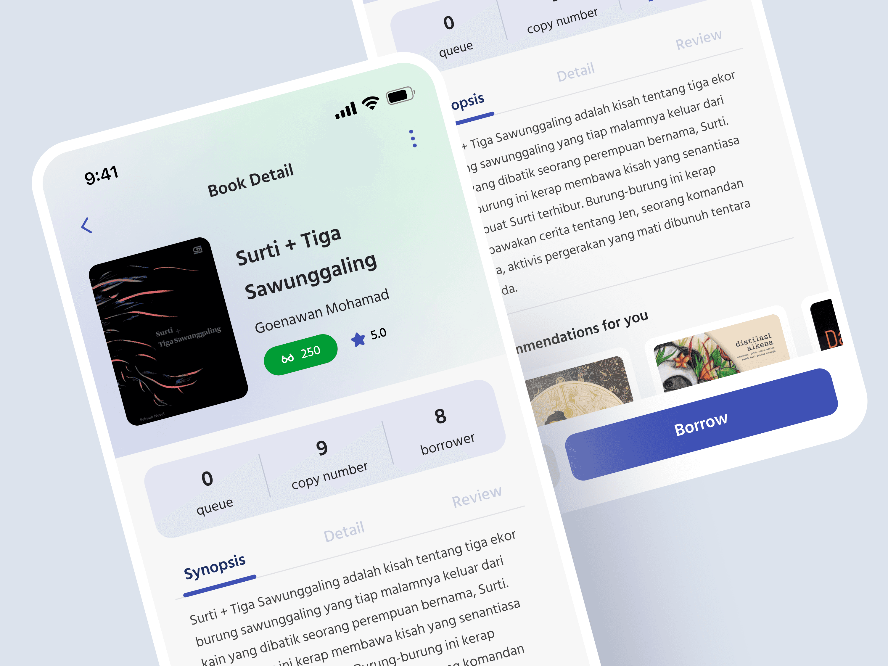 I also redesigned the look and feel of Book Detail to make it clearer and more concise, so that users can scan available information without scrolling first and enhancing Synopsis part so that users can first read the synopsis of the book they want to borrow.
